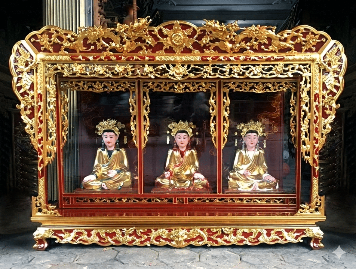 Khám thờ tượng Tam – Ba Ngôi được chế tác thủ công tinh xảo, sơn son thếp vàng truyền thống, thiết kế trang nghiêm, chuẩn phong thủy, phù hợp thờ Tam Thế Phật, Tam Tòa Thánh Mẫu, Tam Vị Thánh trong không gian thờ tự linh thiêng.
