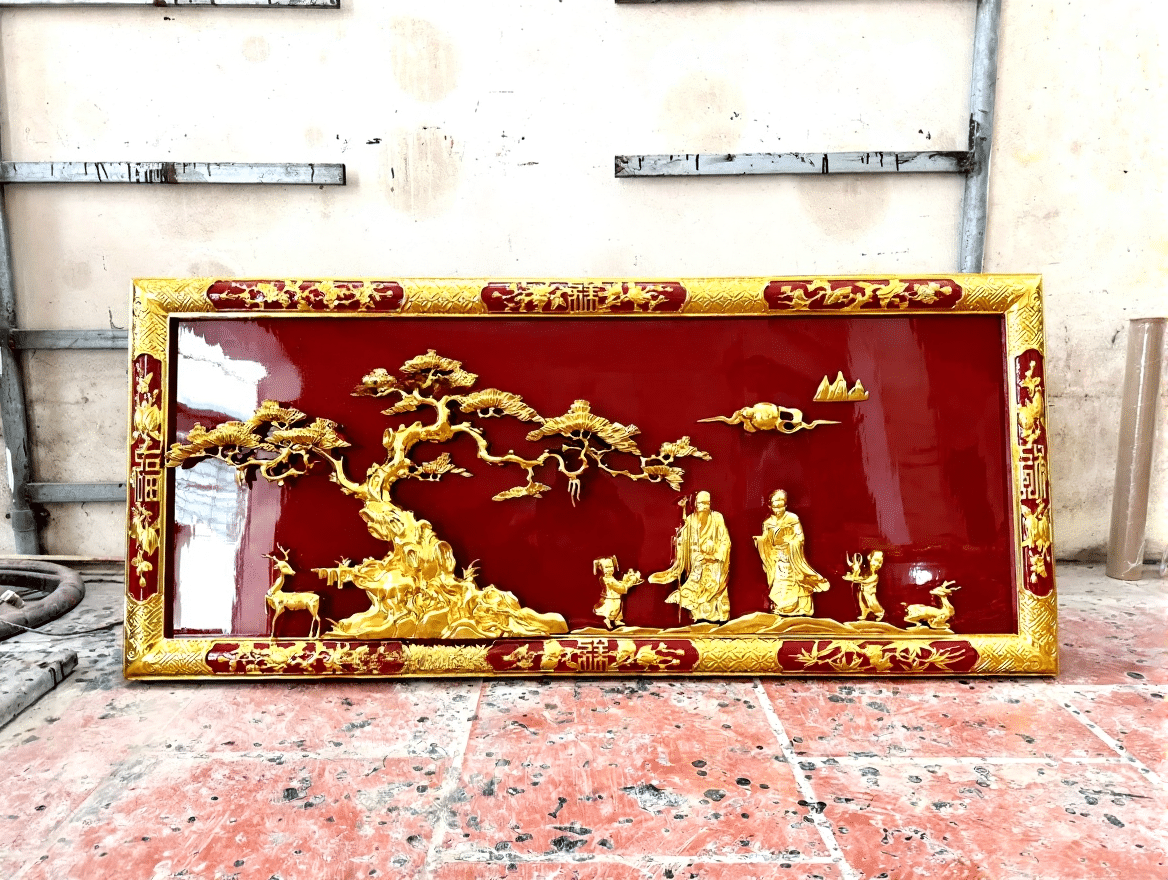 Tranh được chế tác hoàn toàn thủ công từ gỗ tự nhiên tuyển chọn như gỗ mít, gỗ dổi, gỗ vàng tâm – bền chắc, vân đẹp, ít cong vênh, phù hợp treo lâu dài.