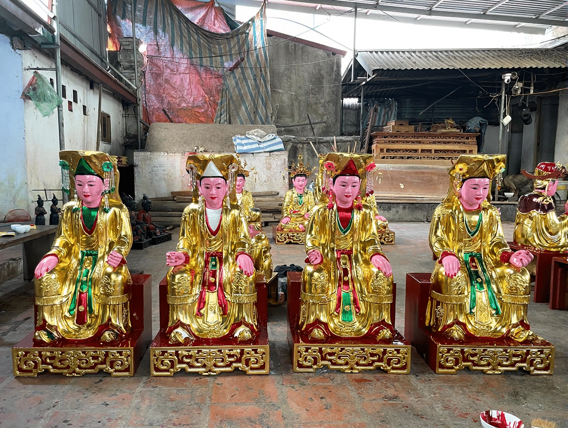 Tượng Tứ Phủ Chầu Bà Sơn Son Thếp Vàng là dòng tượng thờ cao cấp, mang ý nghĩa quan trọng trong hệ thống tín ngưỡng thờ Mẫu Tam Phủ – Tứ Phủ, thường được an vị tại ban Công Đồng Tứ Phủ, đền, phủ, điện thờ, hoặc không gian thờ Mẫu theo đúng căn duyên và phép thờ truyền thống.