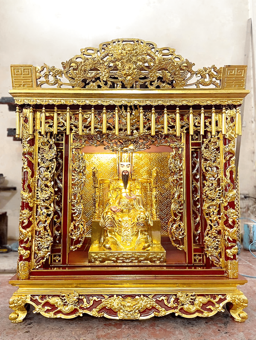 Bề mặt tượng được hoàn thiện bằng kỹ thuật thếp vàng thủ công, sử dụng vàng thật dát mỏng, tạo sắc vàng sâu, óng ánh và bền màu theo thời gian. Lớp vàng kết hợp với nền sơn truyền thống giúp pho tượng vừa linh thiêng, tôn nghiêm, vừa thể hiện đẳng cấp của không gian thờ tự.